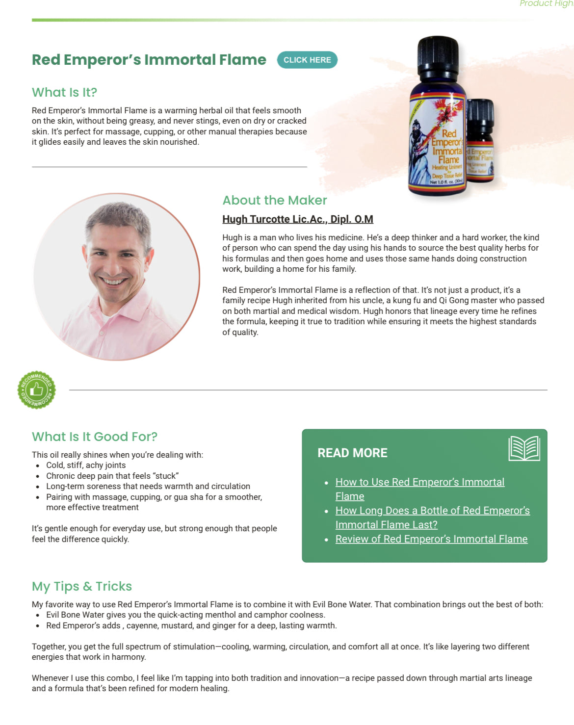 Try Red Emperor's Immortal Flame Liniment today and experience the fast-acting and long-lasting relief that comes with using a world-class product made with heart-centered service and uncompromising attention to detail.